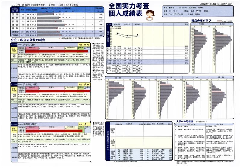 静岡進学ゼミナールでは、小4〜中3クラスに通塾するすべての生徒を対象とした模擬試験『全国実力考査』を年4回実施しています。出題範囲は、それまでの履修内容すべて。思考力・応用力を必要とするハイレベルな問題も出題され、その時点における自分の学力を正しく把握することができます。また、大規模な集団の中での自分の位置を知ることで、広い視野で学力を判断することができます。