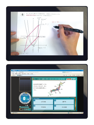 中学生に配布している「さなる式タブレット」は、学力アップに特化した教材そのもの。高機能な学習支援ツールが、授業はもちろんのこと、効率のよい家庭学習や定期テスト対策を実現させます。
