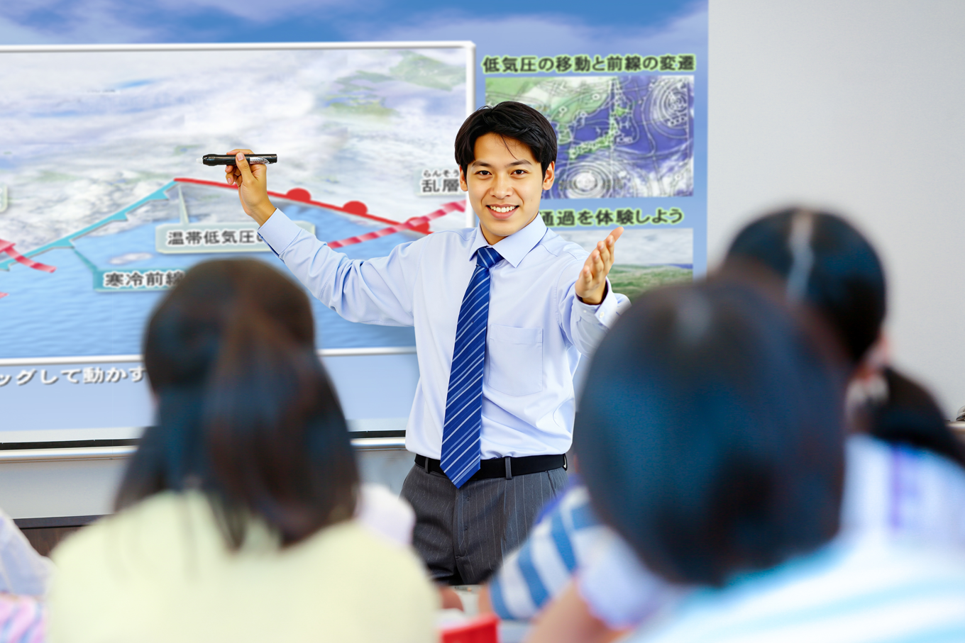 子どもの理解力・記憶力をアップさせ、学習効果を高める映像体感型授業。全校舎の教室に、高彩度のプロジェクターとホワイトボードが設置されています。